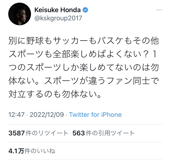 【正論】本田圭佑「別に野球もサッカーもバスケもその他スポーツも全部楽しめばよくない?勿体無い!」
