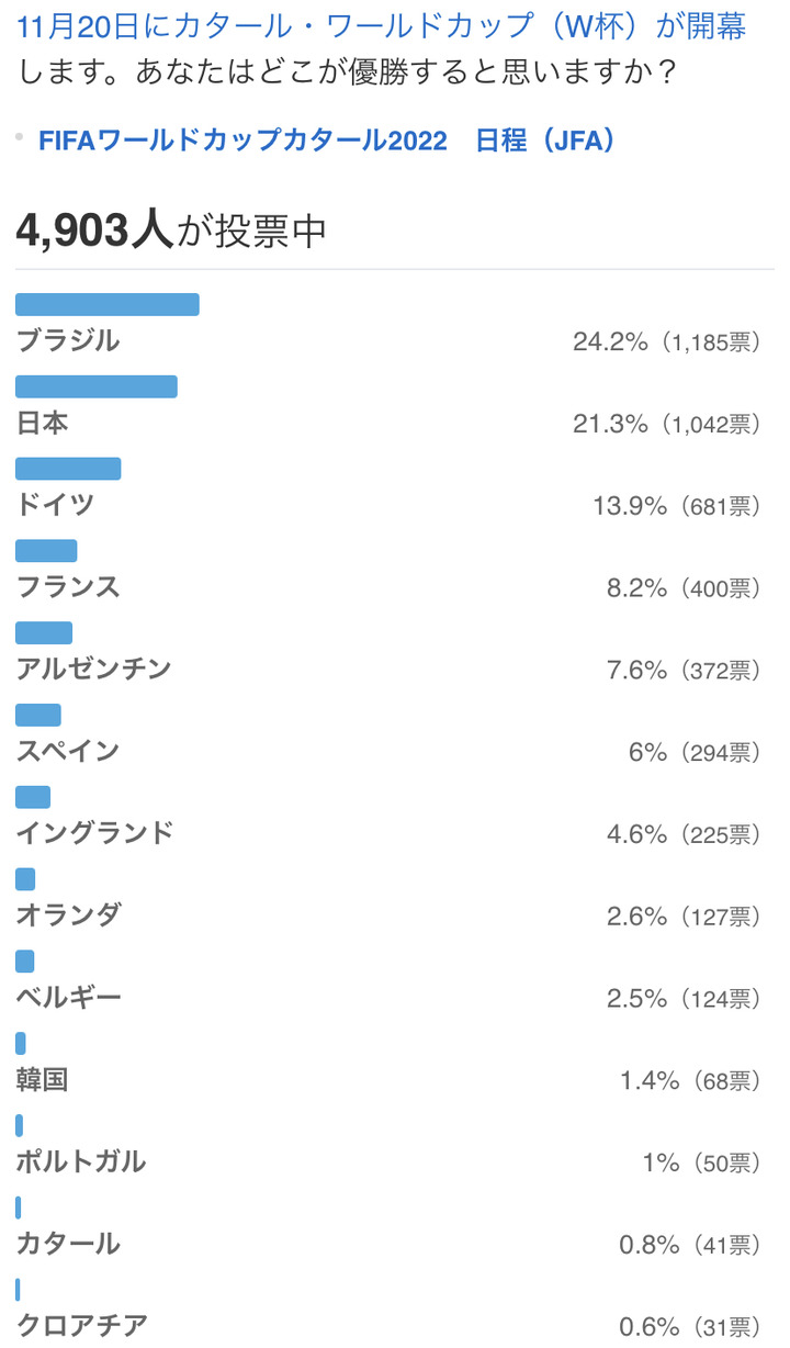 Yahoo「あなたはサッカーワールドカップどこの国が優勝すると思いますか?」