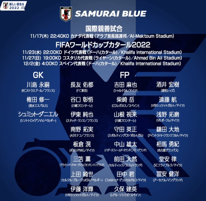 【速報】カタールW杯日本代表メンバー26人発表!キターーー!!!!