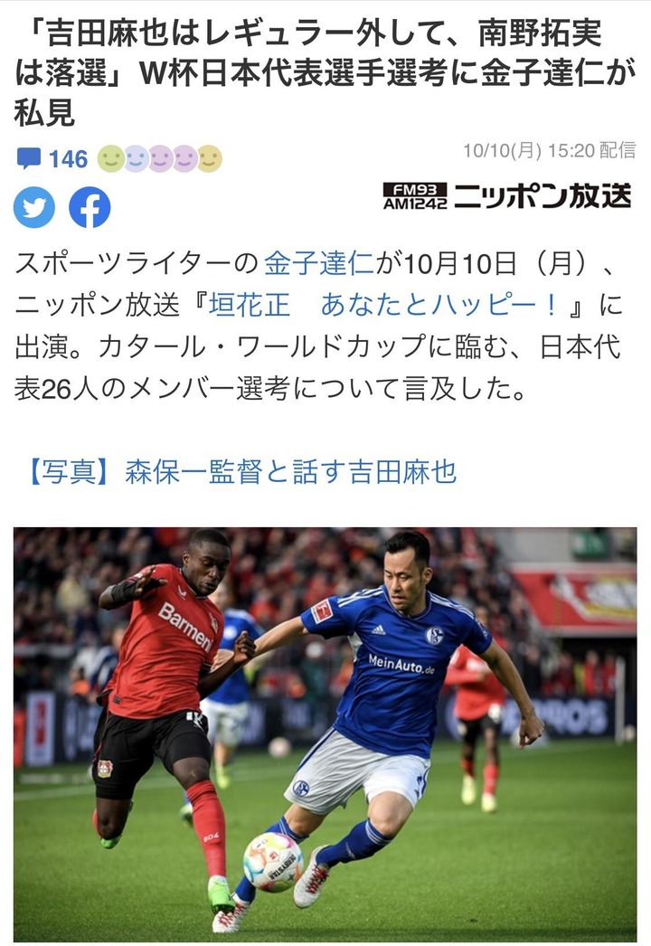 【日本代表】「吉田麻也はレギュラー外して南野拓実は落選!」← これ