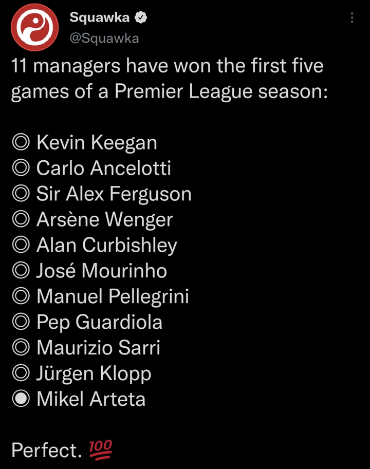 アーセナル・アルテタ監督、名将確定の模様【開幕5連勝】