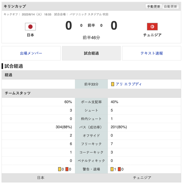 【日本代表 vs チュニジア】前半終了!日本は何度も攻めるも得点できず!0-0で折り返す!