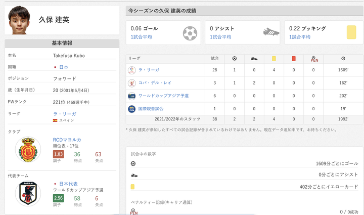 【悲報】久保建英さん、今シーズンの1試合平均ゴール数驚異の0.06…