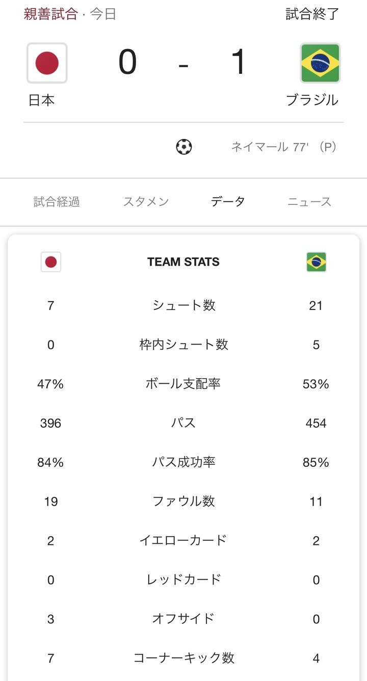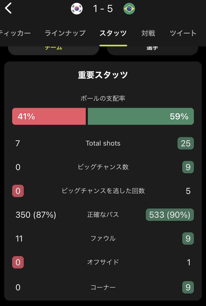 「日本代表 vs ブラジル」と「韓国代表 vs ブラジル」のスタッツを比較した結果www