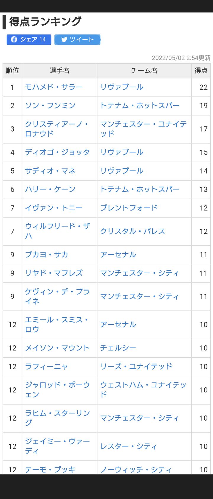 プレミアリーグ得点ランキング上位に37歳のおっさんがいるという事実www