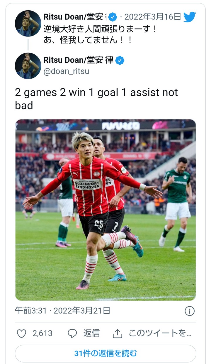日本代表に選ばれなかった堂安律さん、週間MVPに輝くwww