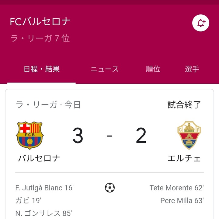 【朗報】バルセロナさん、強豪エルチェとの激戦を制し7位に浮上!www