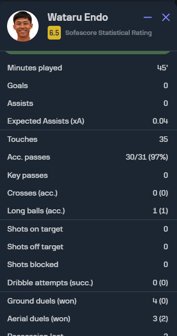 【悲報】前半で交代したリバプール遠藤航のスタッツ…