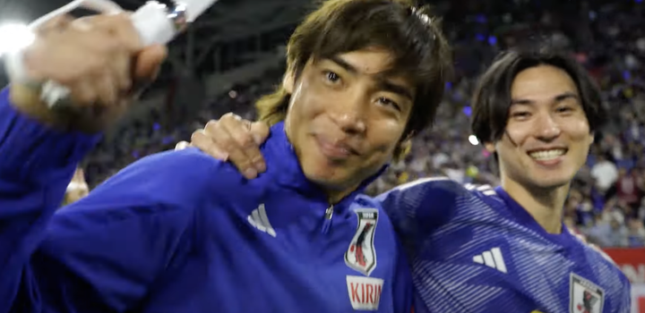 チュニジア戦終了後、インタビューを受ける伊東純也の背後から南野拓実!「バモォッ!」