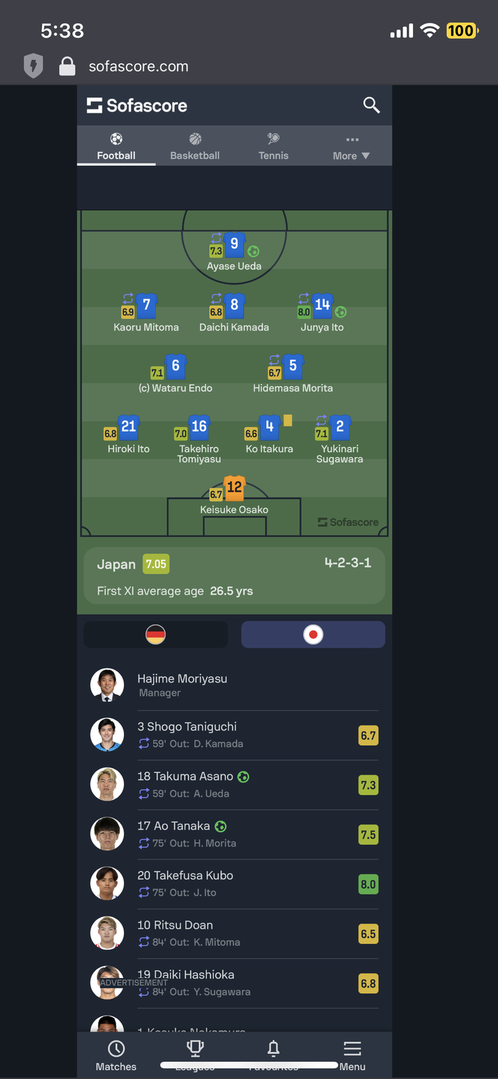 【日本代表】ドイツ戦の久保建英さん、わずか15分で伊東と並ぶソファスコア8.0の最高点を叩き出してしまうw