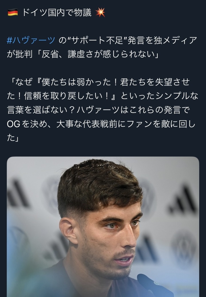 【悲報】ドイツ代表サポさん、FWハヴァーツのコメントでブチギレwww