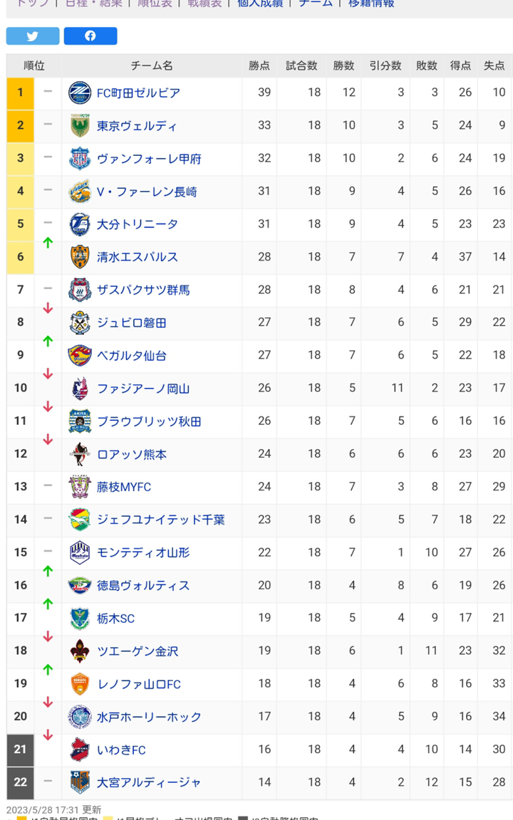 【悲報】J2順位表、ヤバい。お前らの思う3倍ヤバい【サッカーJリーグ】