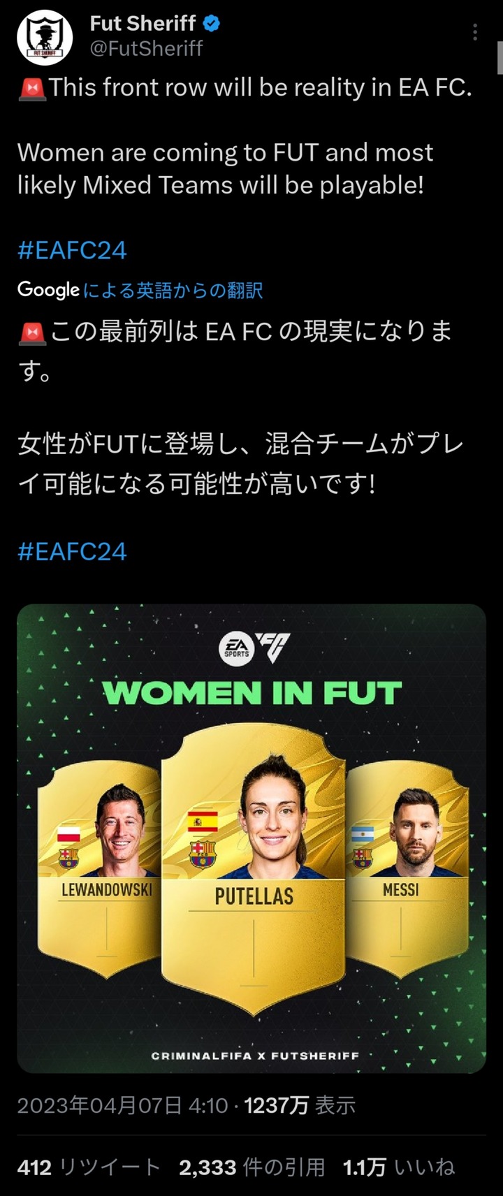 【悲報】サッカーゲームFIFA、男と同じ強さの女性カードが登場し大炎上www