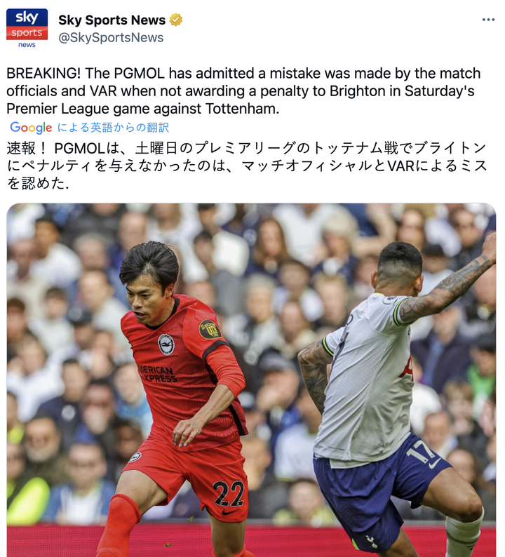 プレミア審判協会「三苫のアレ、PKだったよ!ごめんねー!」