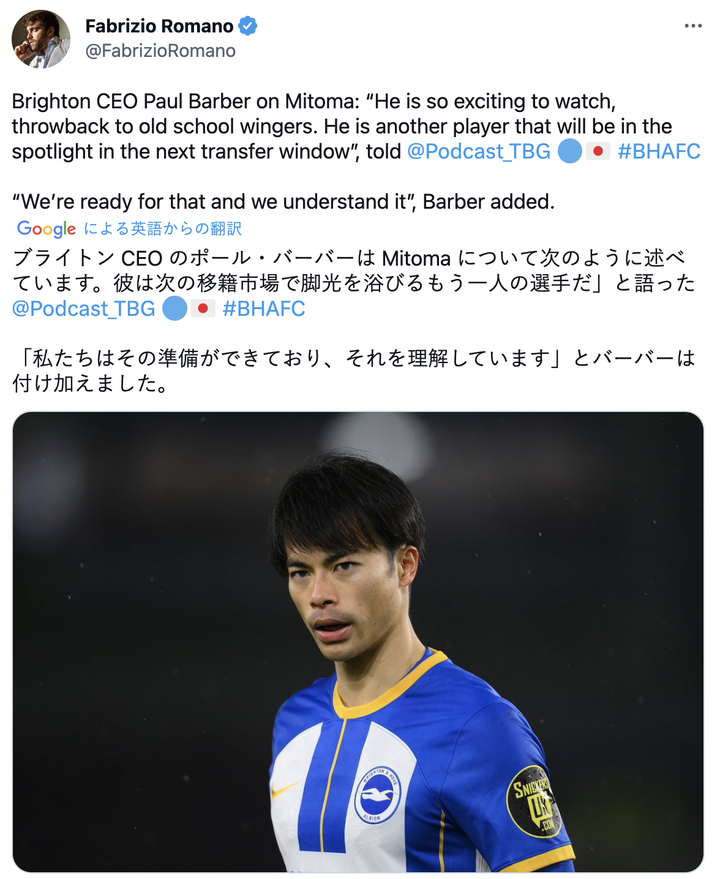 ブライトンCEO「三笘薫は夏に移籍するかも。見据えて準備も開始している」