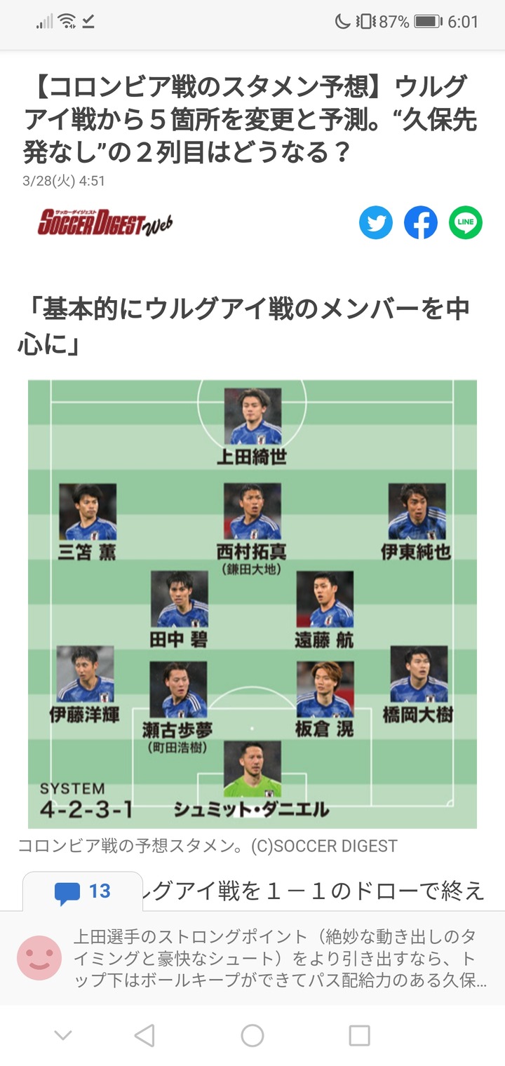 【速報】森保ジャパン、コロンビア戦に挑むスタメン! 久保建英はベンチ予告