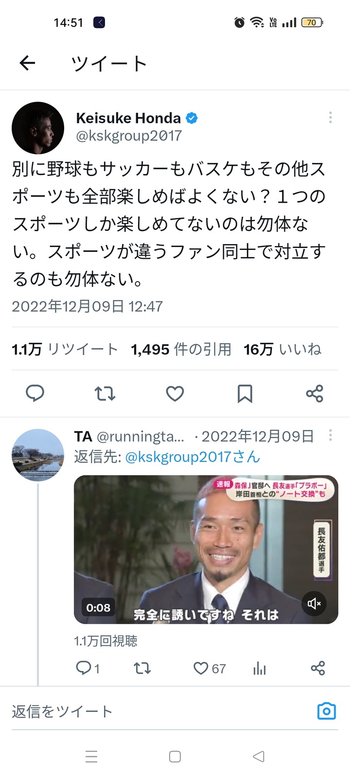 本田圭佑さん「野球もサッカーも全部楽しめばよくない?違うスポーツファン同士の対立やめよ」