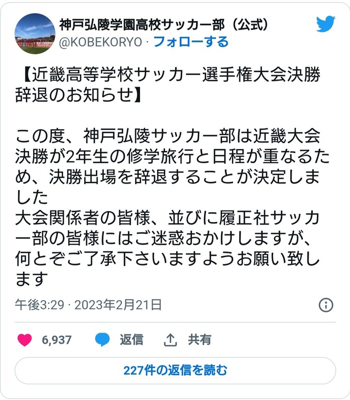 サッカー部員『修学旅行が大事なんで近畿大会決勝辞退しますw』←大炎上へ