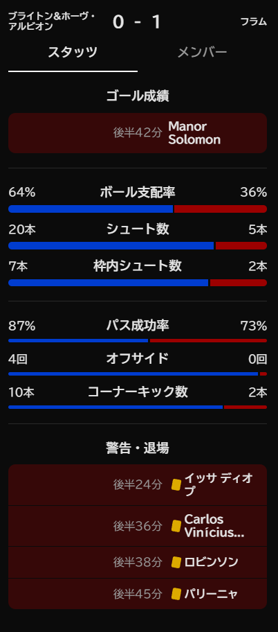 【悲報】ブライトンのフラム戦スタッツが酷いと話題に…
