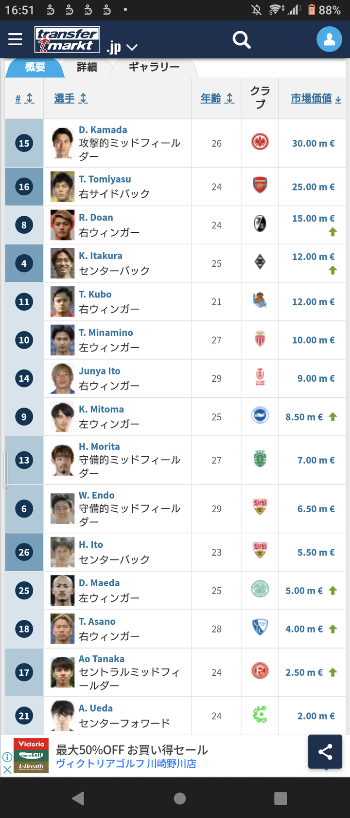 日本代表選手の最新の市場価値!トップは鎌田!三笘はかなり低め…