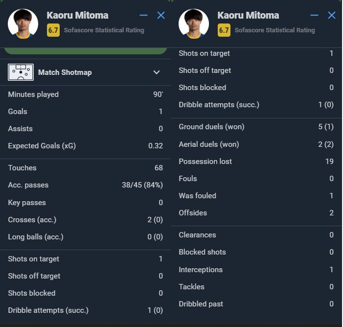 【データ】三笘薫、アーセナル戦のスタッツ&採点が結構微妙!?