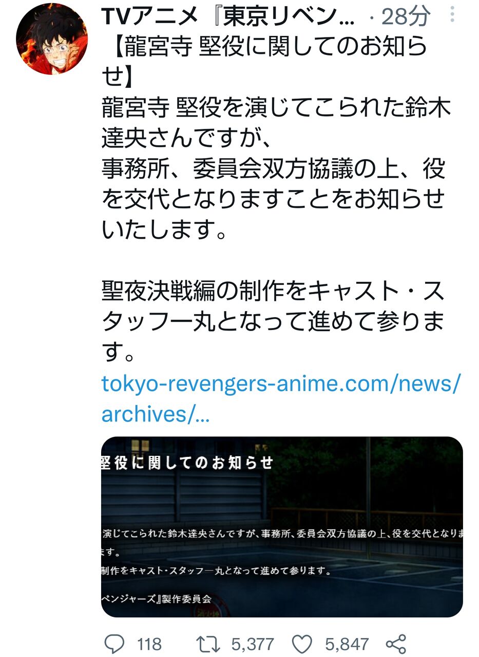 【東京卍リベンジャーズ】ドラケンの声優さん、交代してしまう…