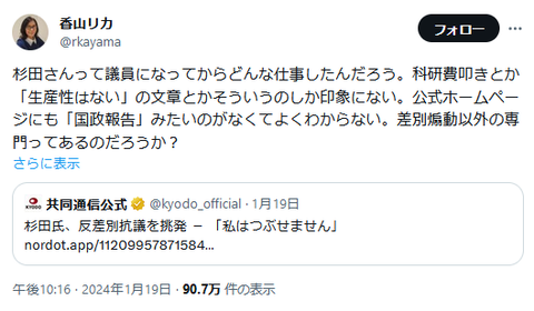 香山リカさん「杉田水脈さんって政治家としての活動実績が見えない。差別煽動以外で教えてください」→支持者ですら具体的に答えられず