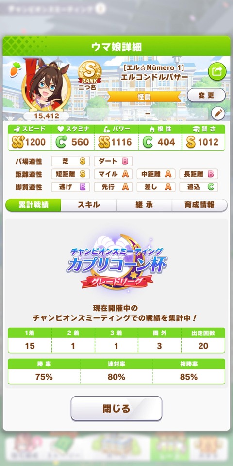 【ウマ娘】えっ、逃げCエルで無双!?カプリコーン杯tier1の噂があったエルはどれぐらい活躍してる?