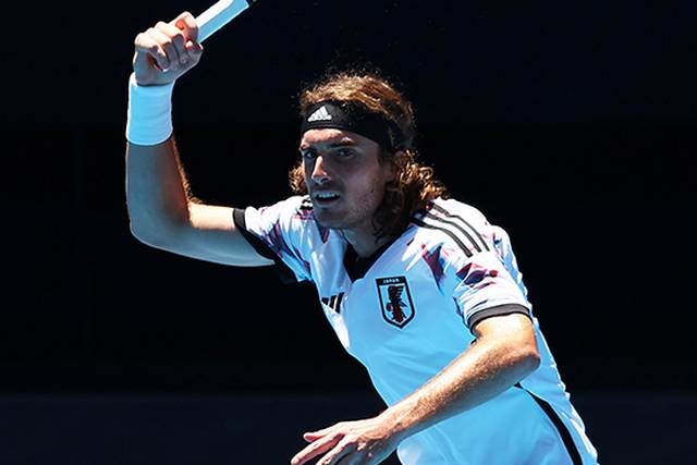 チチパスがサッカー日本代表のユニフォームを着用 全豪オープン会場で練習