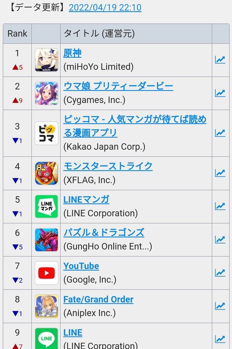 【セルラン速報】原神1位 ウマ娘2位 FGO8位 ヘブバン16位 グラブル35位 マギレコ75位