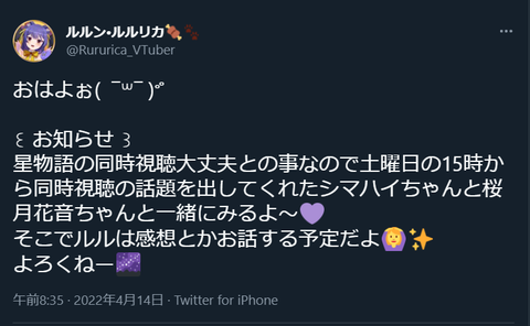 【.LIVE】4月16日(土)の15時からルルちゃん、シマハイちゃん、桜月花音ちゃんと一緒に星物語の同時視聴があるぞ!【Vtuber】
