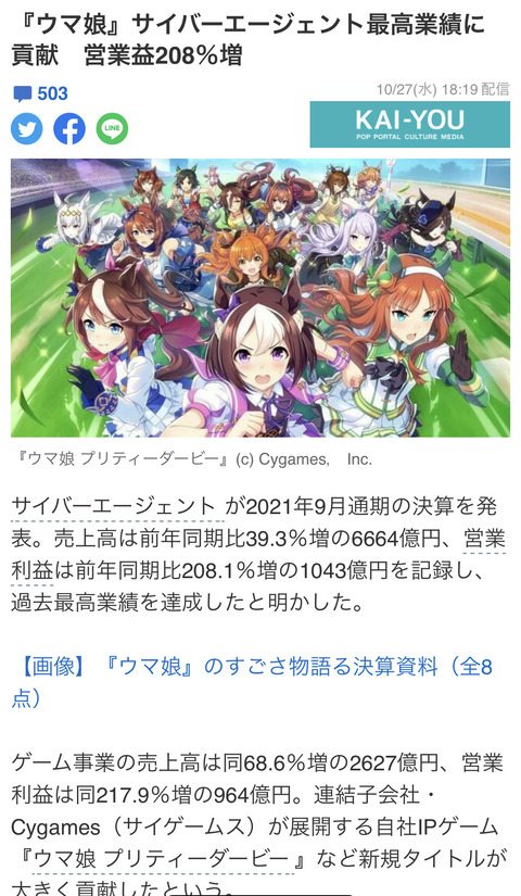 【朗報】サイバーエージェント ウマ娘の成功で営業益208%増
