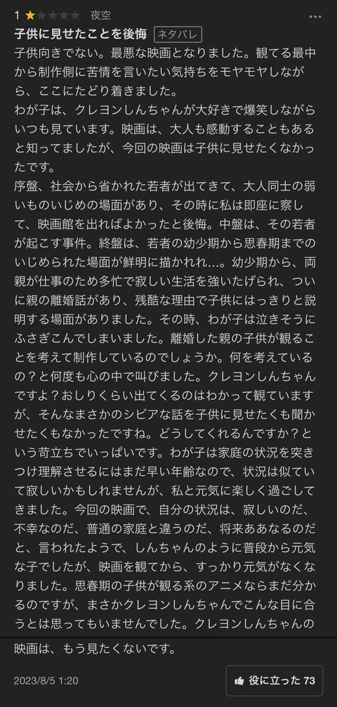 【悲報】シングルマザーさん、クレしん映画に子を連れて行ってしまい長文でお気持ち表明【弱者(男性)の希望を奪う?】