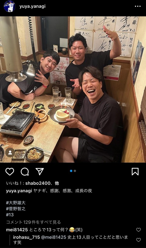 中日ドラゴンズ柳裕也さん、ノーヒットノーラン達成祝いを開催【濃いメンツで飲んだ!?】