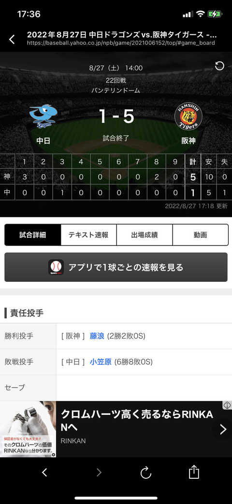 【終盤実況】中日1ー5阪神 中日ドラゴンズ小笠原慎之介初回3失点に泣く。根尾昂8回に痛恨のダメ押し2点 打線は藤浪晋太郎に復活快投許す…