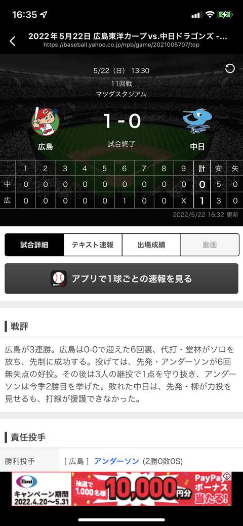 【終盤実況】広島堂林決勝ソロ。中日柳裕也は1失点ムエンゴ。打線はアンダーソンら崩せず。