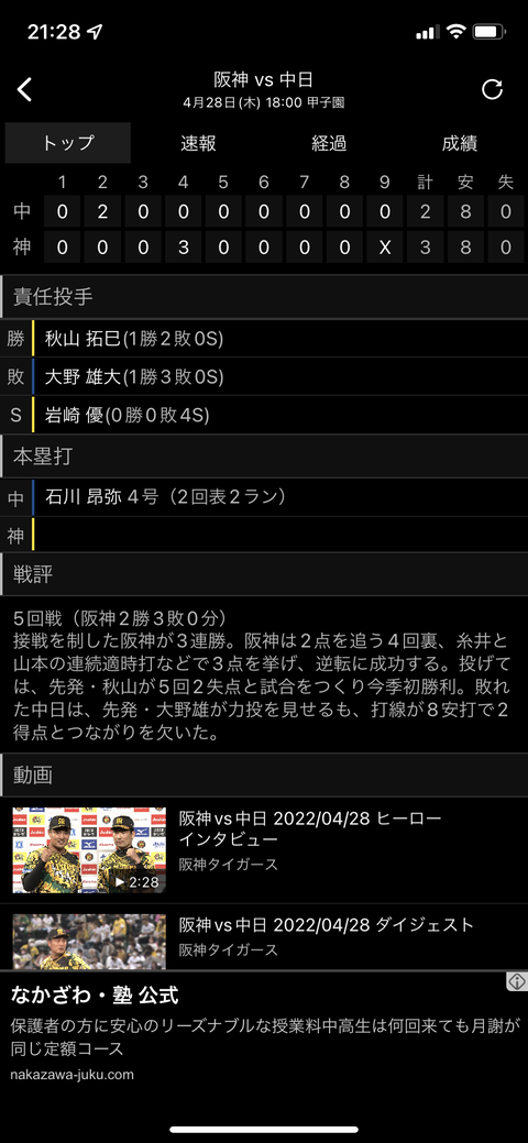 【大島さん死球も痛かった】セ・リーグ T 3-2 D[4/28] 阪神3連勝!山本同点スクイズ、糸井好走塁で勝ち越し!秋山5回2失点今季初勝利 中日・大野8回3失点 【勢いつく阪神さん】
