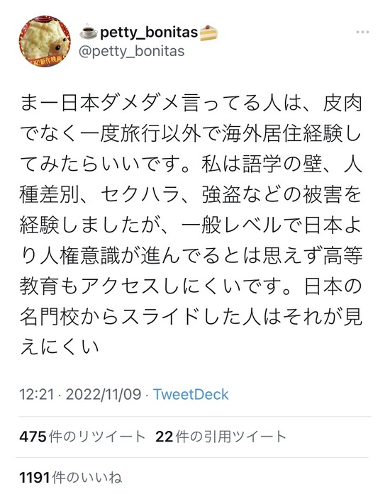 ツイッター「日本ダメとか言ってるアホは一回海外に住んでみろよ」