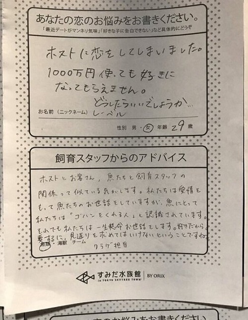 ホスト狂い女性に対する水族館の飼育員のアドバイスが適格だと話題に(画像)
