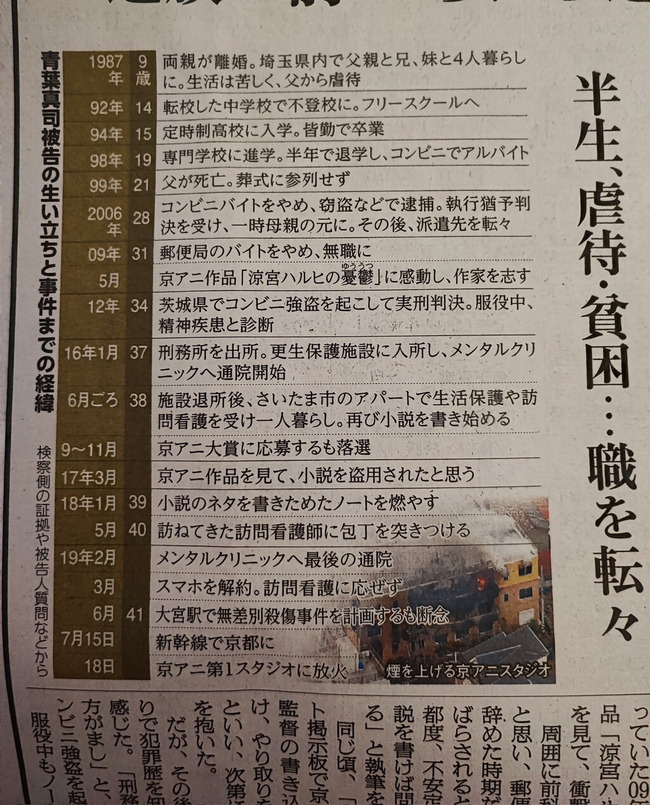 【画像】京アニ放火の青葉真司、人生年表が開示されてしまう