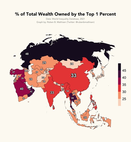 国別の「1%の富裕層が国全体の富の何%を持ってるか」を図にしたものがヤバすぎるwww