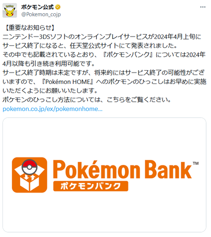 ポケモンバンク、将来的にサービス終了の可能性とのお知らせ。これからどこでトリプルバトルやればいいんだよ…!