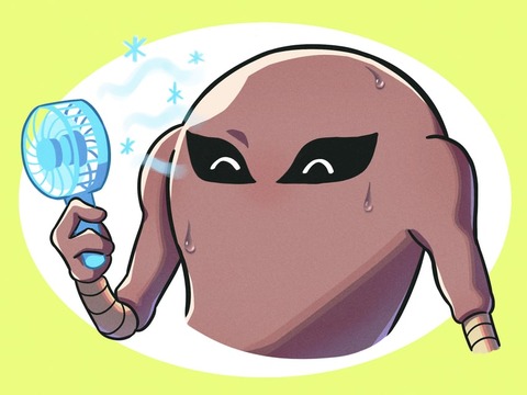 ハンディ扇風機で涼むサワムラー