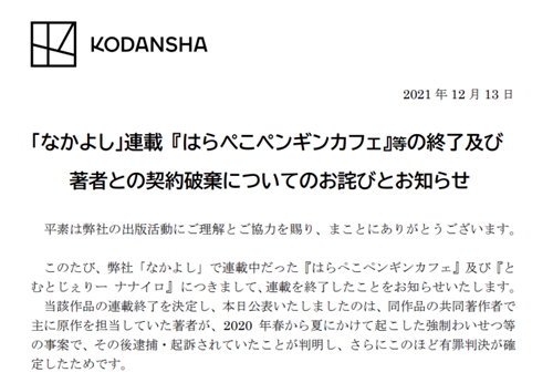 少女マンガ雑誌「なかよし」掲載「はらぺこペンギンカフェ」の原作担当、小学生への強制わいせつで連載打ち切り