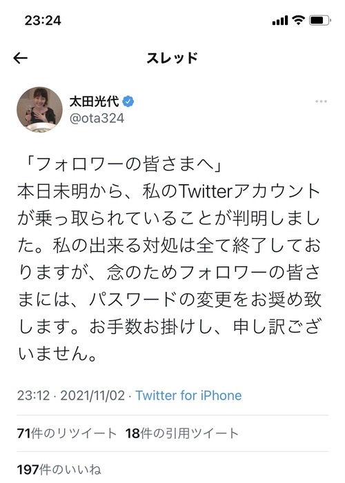 【悲報】太田光代さんTwitterを乗っ取られていた
