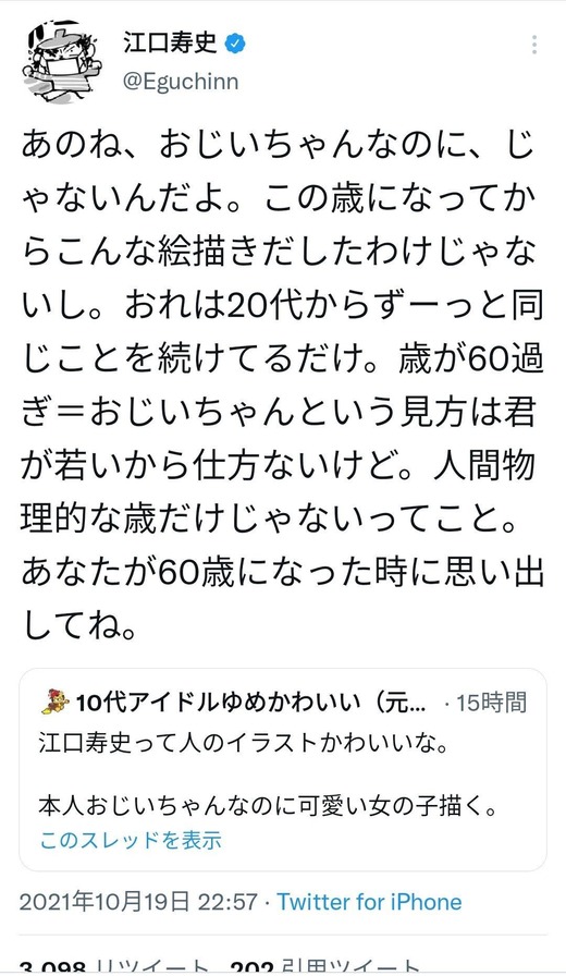 漫画家・江口寿史さん(65)、「おじいちゃんなのに可愛い女の子描く」ツイートに反応