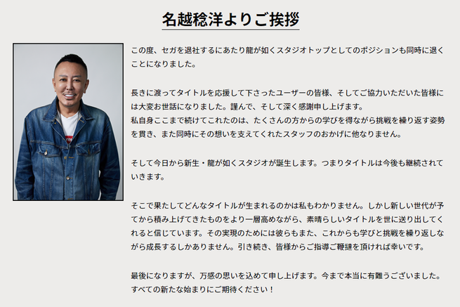 龍が如くの名越稔洋さん、セガ退社を発表