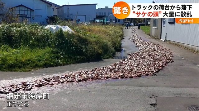 【画像】トラック運転手、路上に大量のサケをばら撒いてしまう