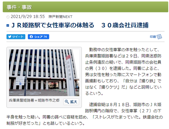 駅で女性車掌を動画撮影しながら触った30歳会社員逮捕 「私は撮り鉄ではない!撮りケツだ!!」