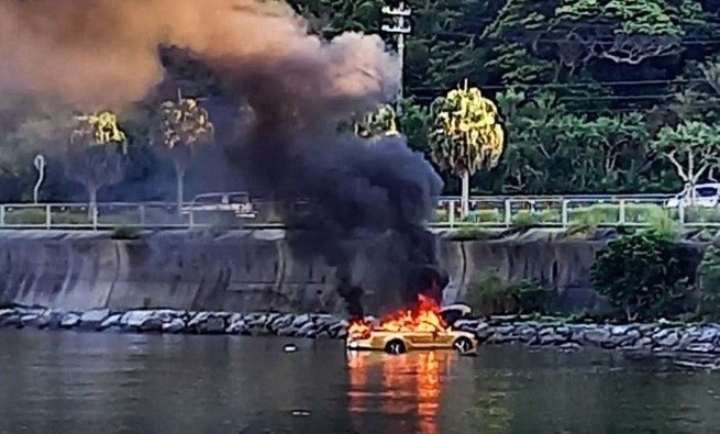 20代男女「助けて!高級外車で干潟に入ってしまったら抜け出せなくなったの!」→半分近く水に浸かり牽引中に爆発 沖縄